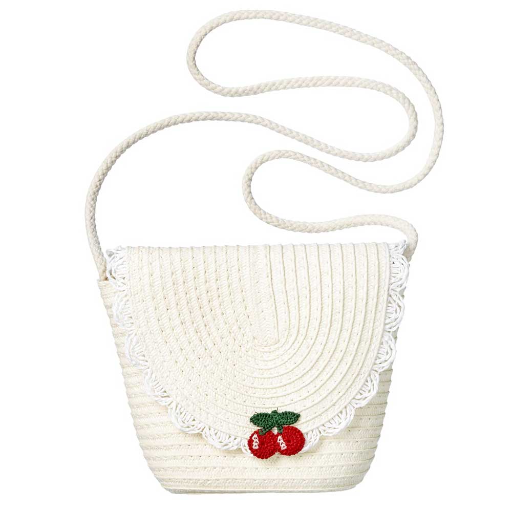 Elegante borsetta in paglia bianca, con lunga tracollina e pattina ribaltabile sfrangiata impreziosita da deliziose ciliegine ricamate, un dettaglio vivace e raffinato che aggiunge un tocco di freschezza e originalità.