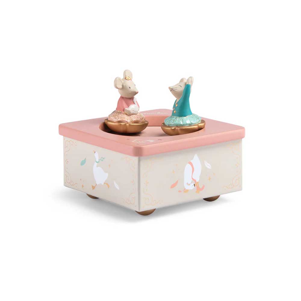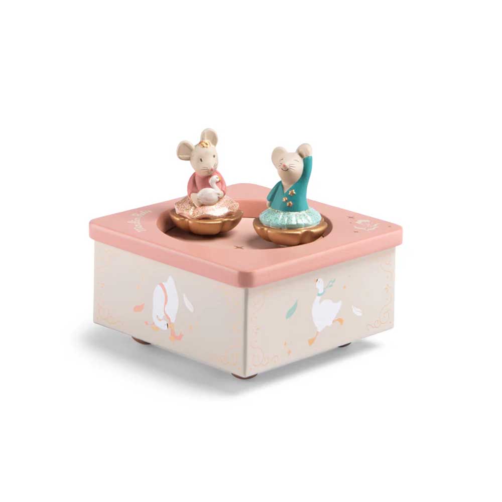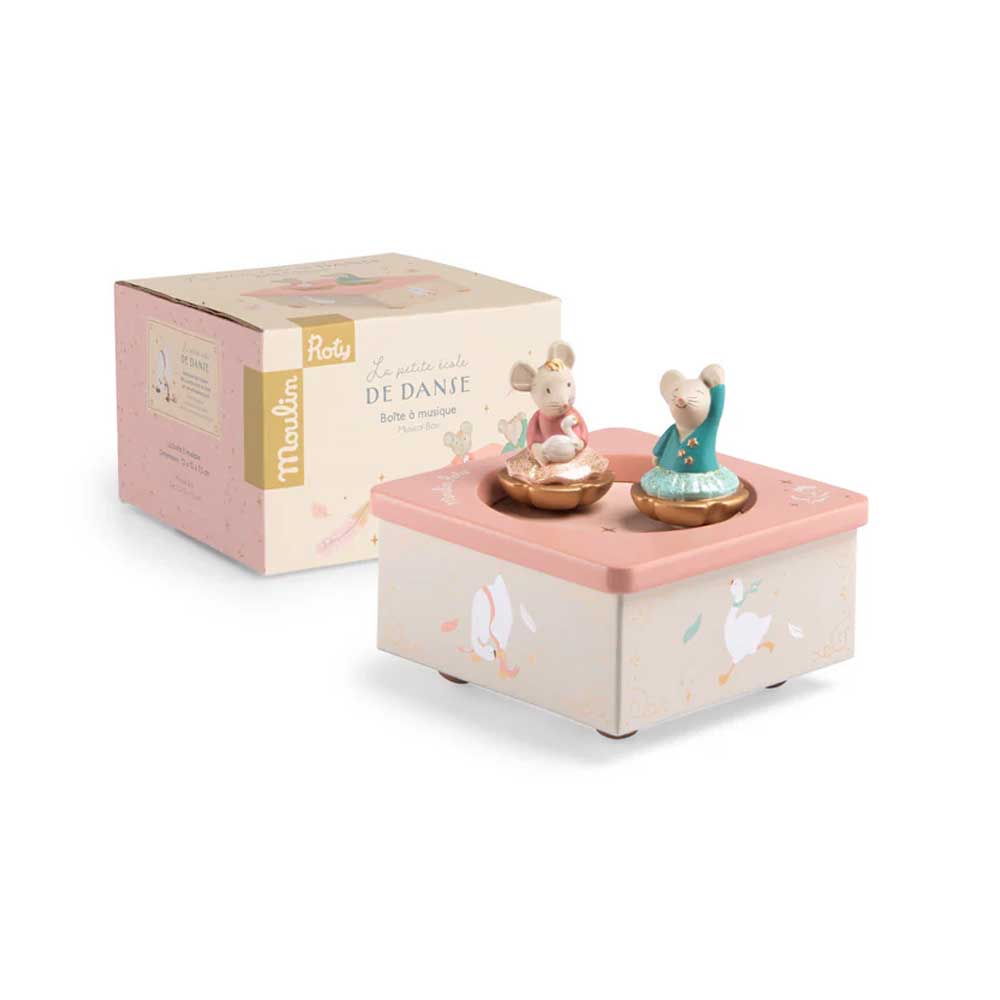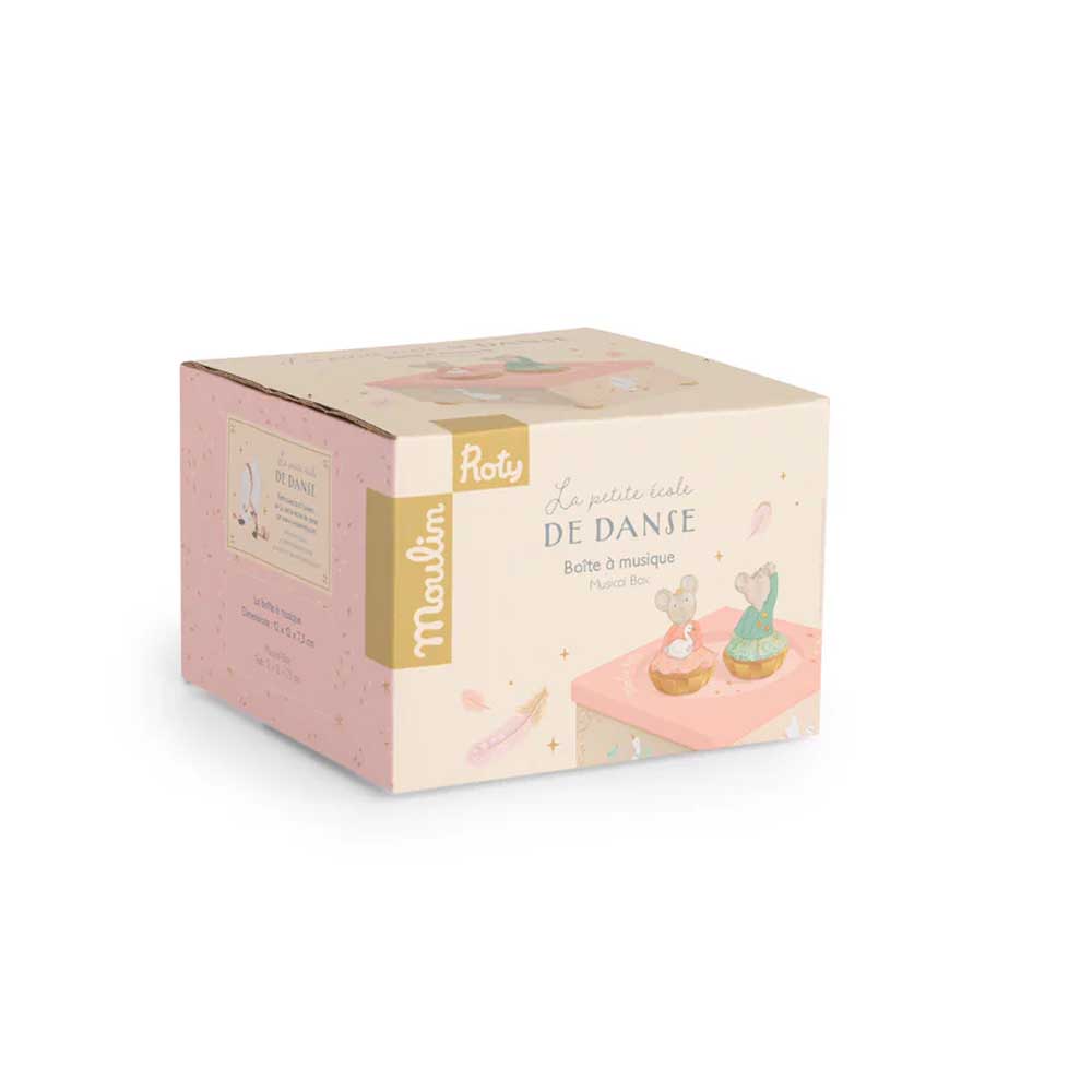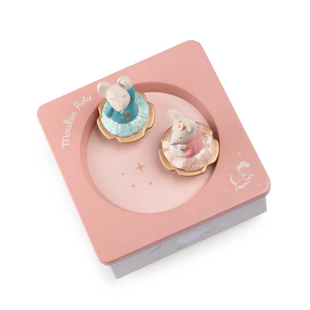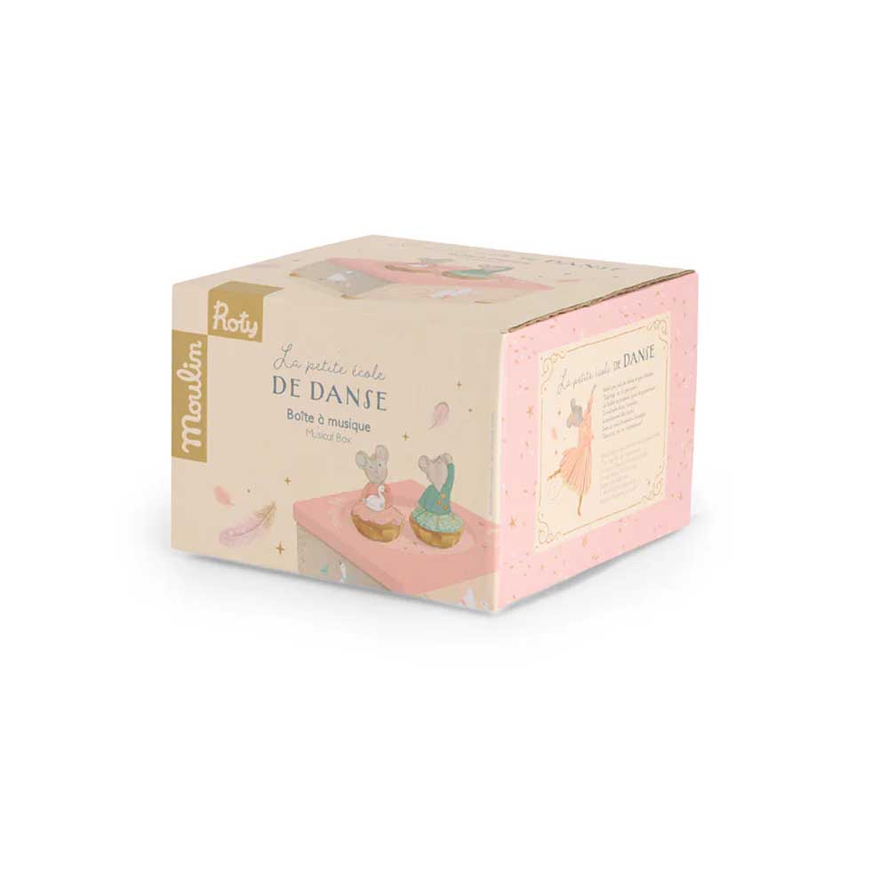 La scatola musicale della celebre collezione La Scuola Di Danza di Moulin Roty è un oggetto poetico e senza tempo, progettato per incantare i più piccoli. Caratterizzata da una solida base in legno finemente illustrata, ospita due graziosi topolini in resina che danzano armoniosamente. Una volta data la caricata è sufficiente appoggiare sulla superficie i due personaggi che inizieranno a muoversi grazie ad un sistema magnetico racchiuso all’interno dello stesso.