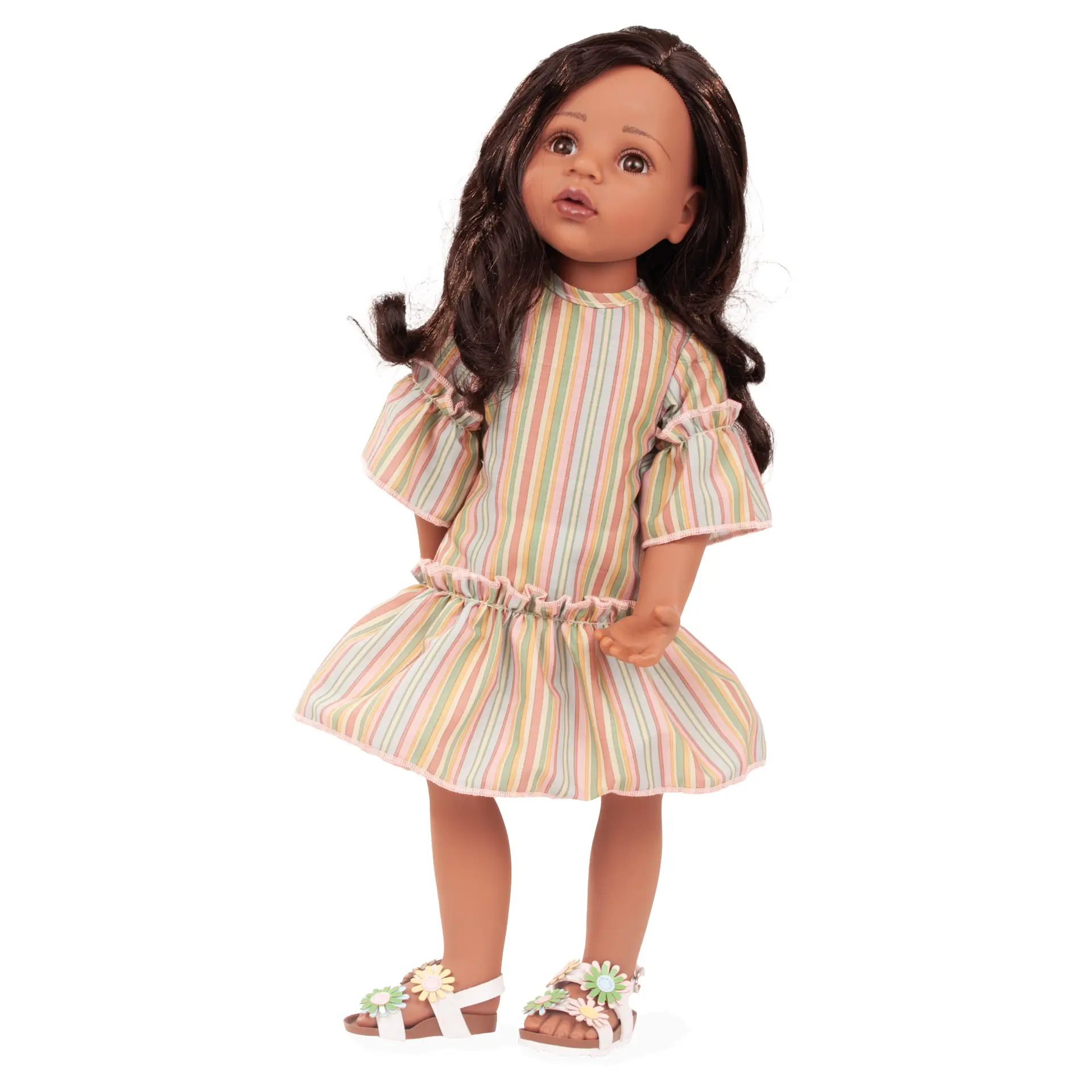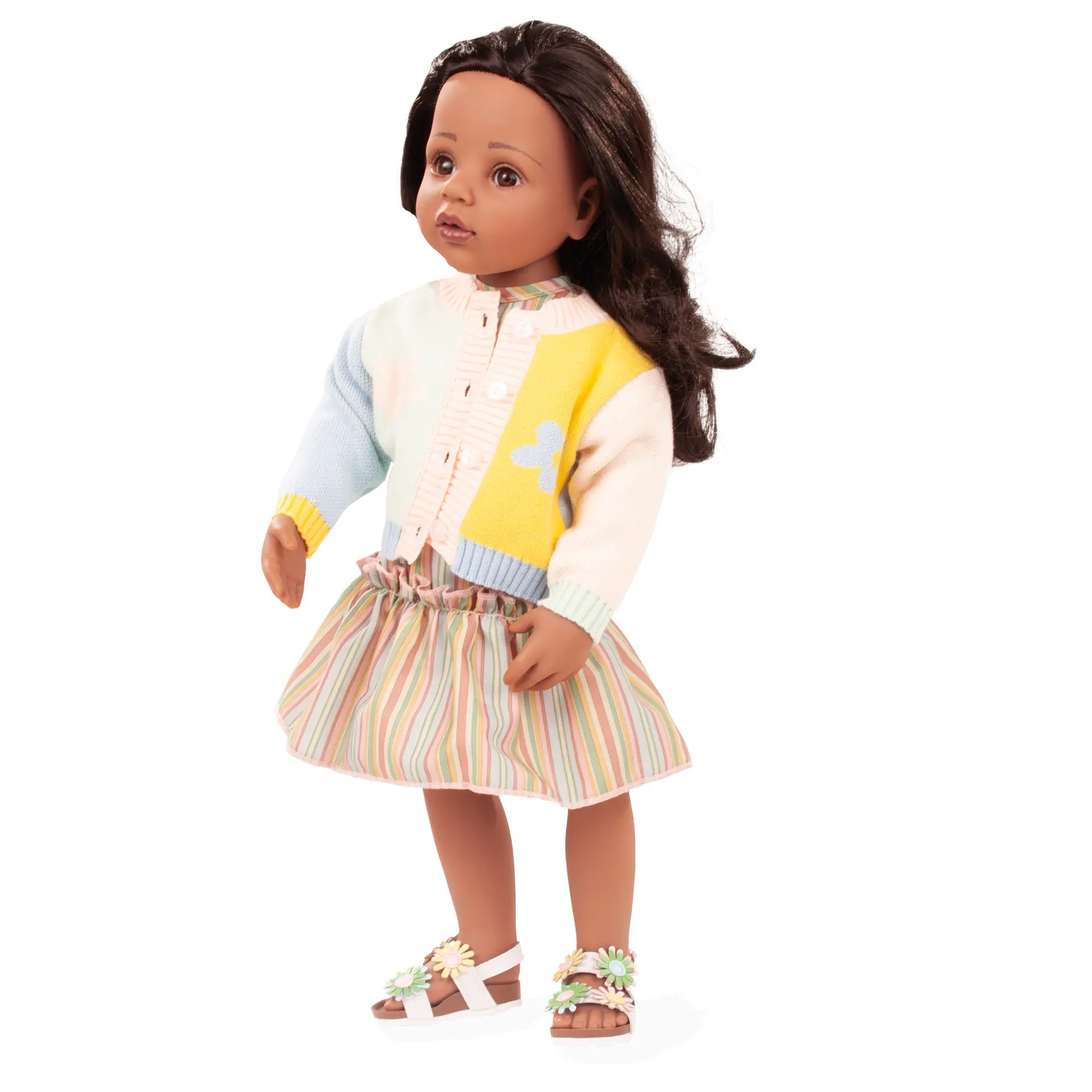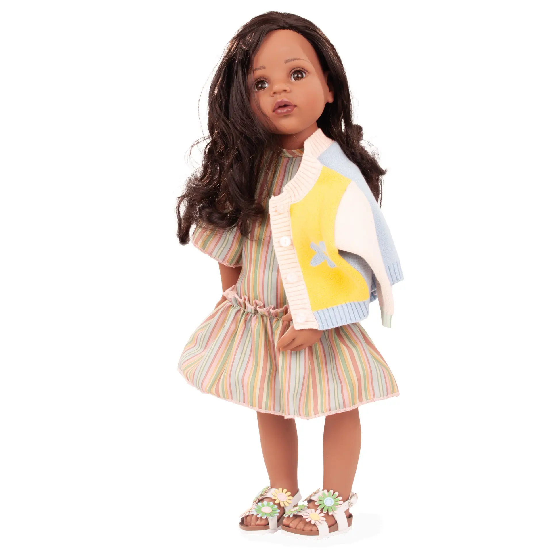 Questo raffinato set dai colori estivi e delicati comprende un abito estivo a righe con raffinate balze, una giacchina in maglia fine con motivo floreale e sandali coordinati con fantasia floreale. Come tutti i prodotti GÖTZ è realizzato con cura e dona alla bambola un look alla moda ed elegante. La qualità della texture valorizza e sottolinea gli elevati standard di lavorazione e design.