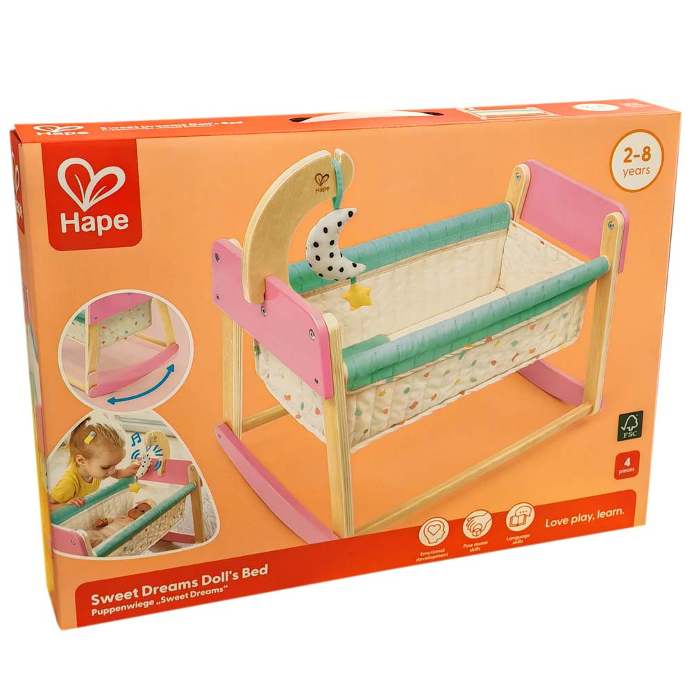 Hape presenta una raffinata culla a dondolo realizzata con materiali ecosostenibili di alta qualità, progettata per accogliere bambole e peluche fino a una lunghezza di 45 centimetri. La struttura è interamente costruita in legno resistente, con una finitura impeccabile che rispetta i più rigorosi standard di sicurezza internazionali. Grazie alla base curva, la culla offre un movimento oscillante realistico e fluido, permettendo ai bambini di simulare i gesti della cura quotidiana in modo naturale. Il set è arricchito da un morbido materassino rimovibile completo di cuscino e da una graziosa giostrina sospesa con stelle e una luna dotata di campanellino integrato, che aggiunge un elemento sonoro e visivo stimolante.