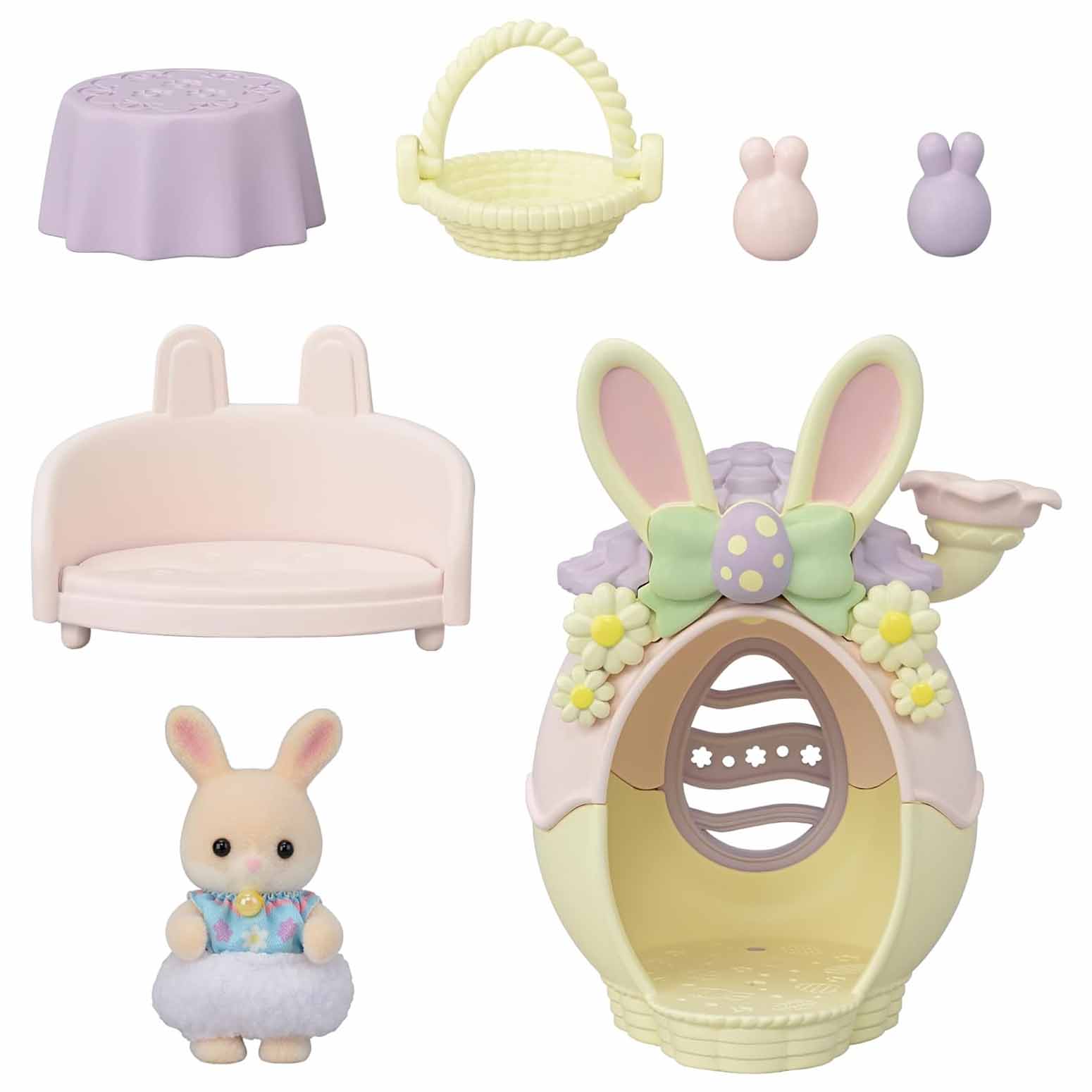 - Contenuto della confezione: 1 Bebè Coniglio Marguerite con abito speciale, 1 unità casetta/portauova, 2 uova di Pasqua sagomate (rosa e viola), 1 cestino, 1 tovaglia, 1 divano in miniatura.