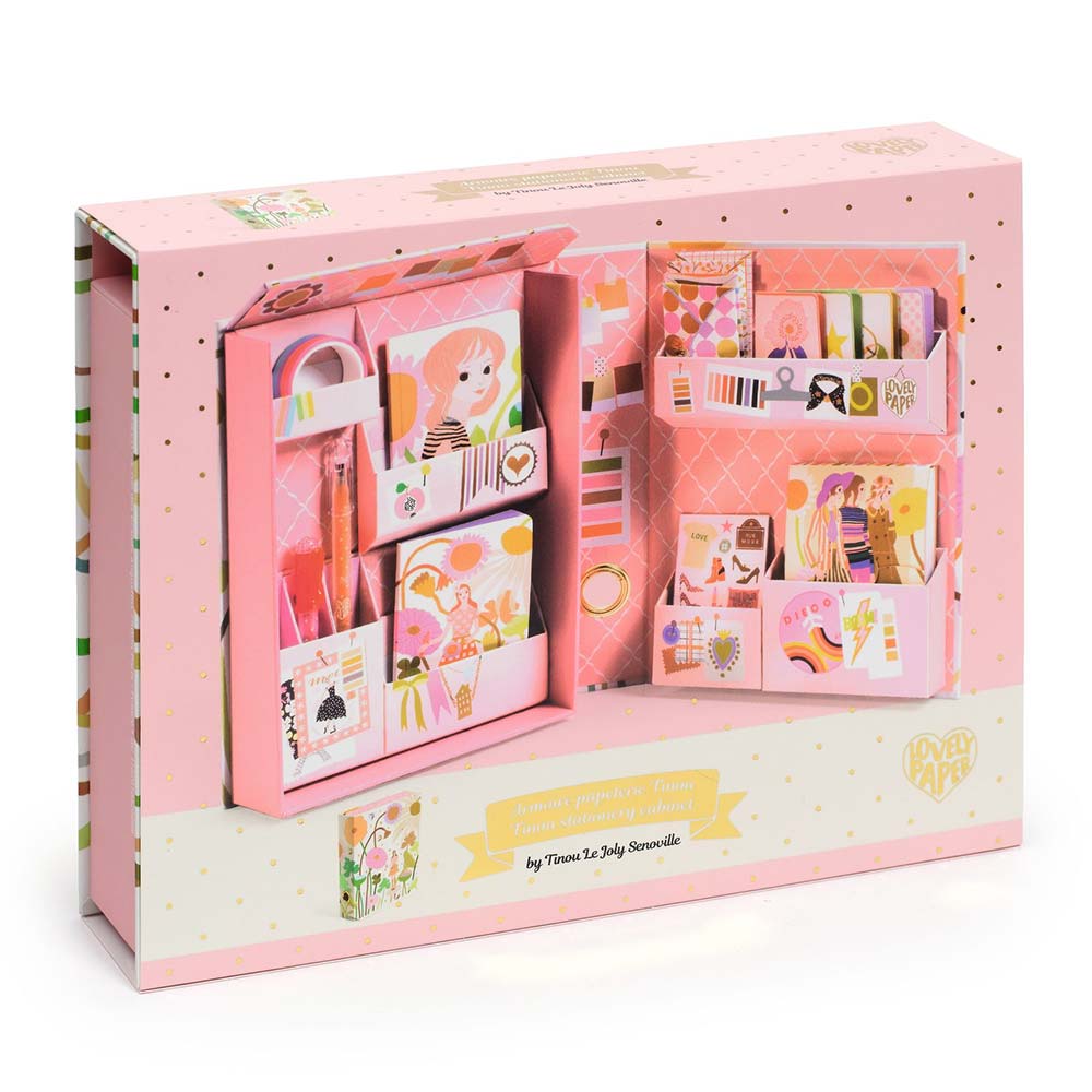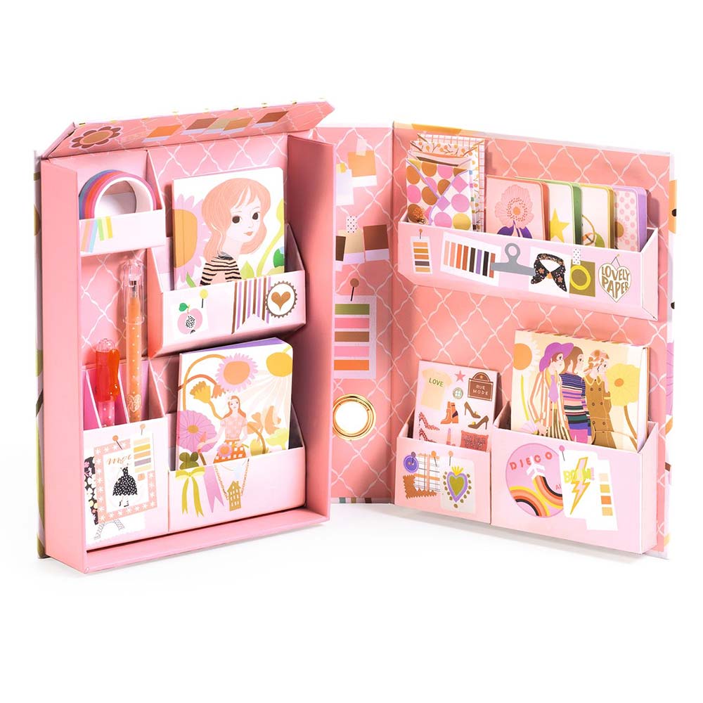 Apri le porte della creatività con l’Armadio di Cancelleria Tinou di Djeco, un vero e proprio scrigno ispirato al mondo glamour della moda. Concepito come un elegante libro che si apre per rivelare una miriade di scomparti segreti, questo set racchiude un assortimento raffinato e completo di articoli di cartoleria essenziali. All’interno troverai due quaderni dal design esclusivo, un pratico blocco note, quattro biglietti e quattro buste coordinate, un nastro adesivo decorativo, quattro schede di adesivi scintillanti e due penne gel dai colori vivaci. È il must-have perfetto per organizzare le tue idee, personalizzare le tue creazioni e lasciare libero sfogo alla fantasia con uno stile inconfondibile.