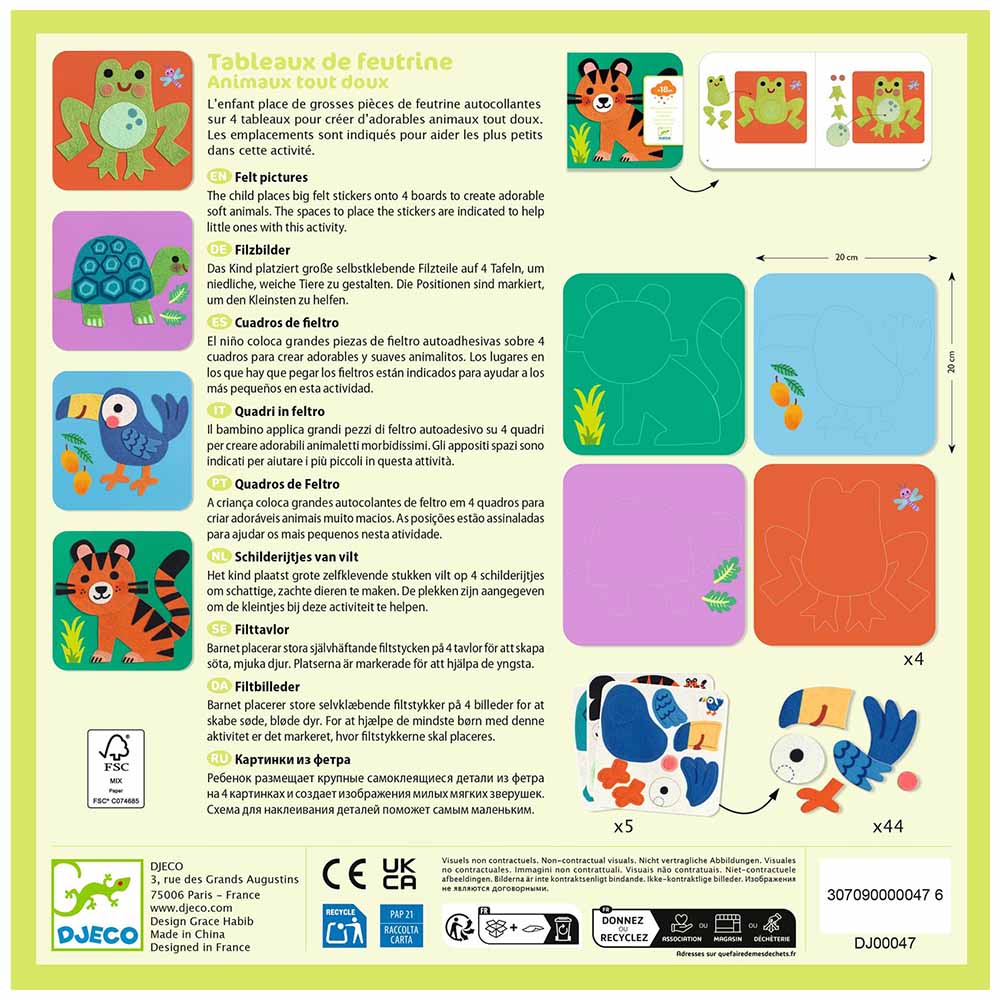 - Contenuto: 4 tavole illustrate, 5 schede di adesivi in feltro, 1 libretto d’istruzioni visivo