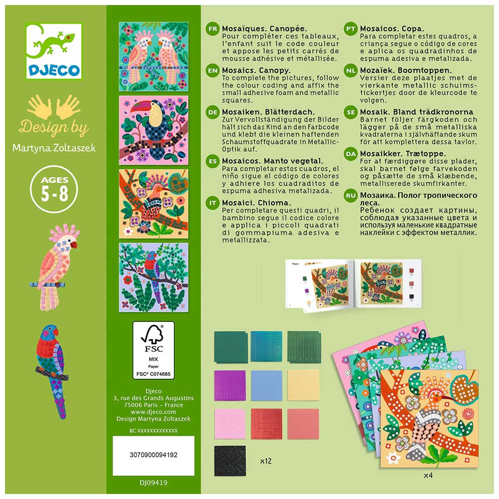- Contenuto: 4 tavole illustrate, 12 fogli di quadratini adesivi metallizzati, 1 libretto di istruzioni passo dopo passo a colori.