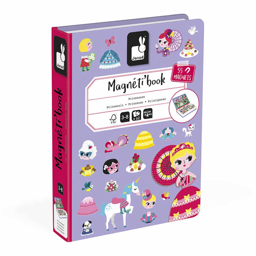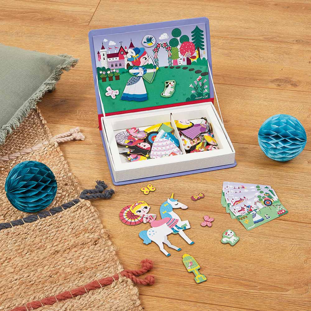 Gioco didattico magnetico in cartone sul tema delle principesse. Include 55 magneti e 7 carte.