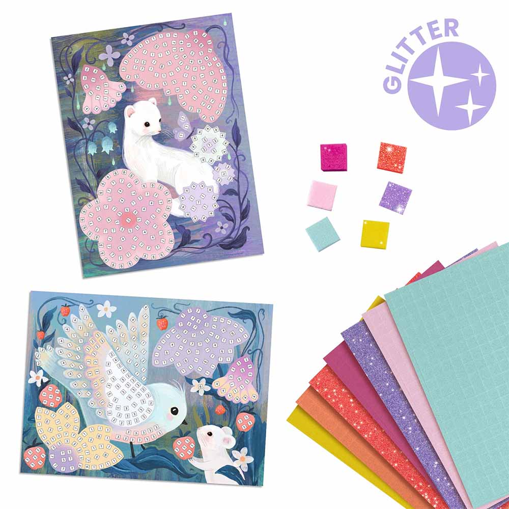 - Contenuto: 2 quadri illustrati, 7 fogli di adesivi in gommapiuma (glitter, metallizzati e opachi), 1 libretto di istruzioni a colori