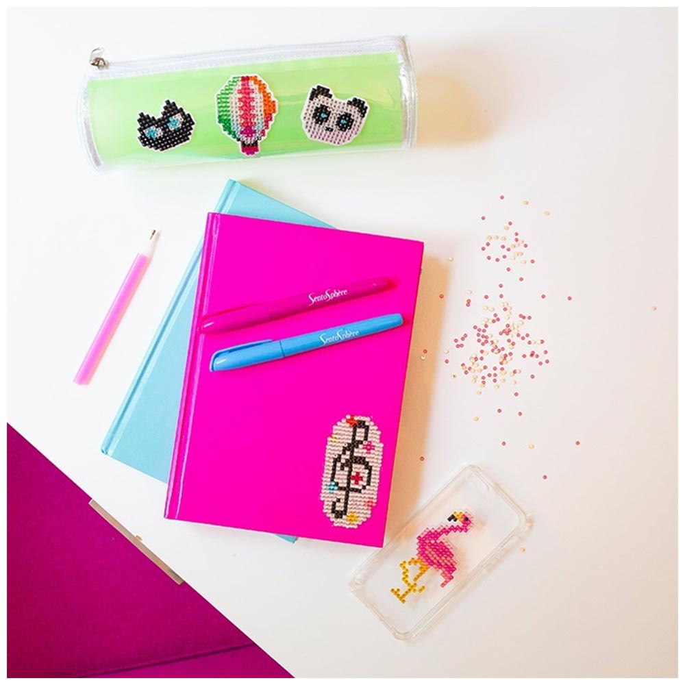 Crea più di 15 Adesivi Abbaglianti! Ricopri bellissimi motivi con migliaia di diamanti colorati per creare adesivi scintillanti che possono decorare qualsiasi superficie desideri. Dall’astuccio per le matite ai quaderni e ai portapenne, questi adesivi aggiungono un tocco di luce e colore ovunque vengano applicati.