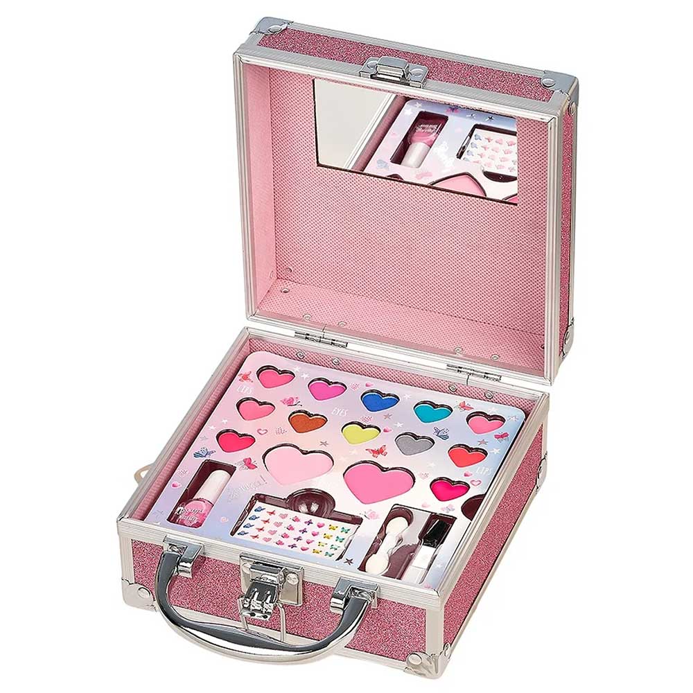 Stai cercando un regalo effetto wow? Con questa scintillante valigetta lascerai a boca aperta chiunque la riceverà. Una valigetta make up degna di una vera truccatrice. Specchietto interno, assortimento di lucida labbra, ombretti , blush, 1 smalto, adesivi per le unghie e pennellini. La Valigetta ha un design molto fashion di colore rosa glitter, è dotata di una maniglia resistente, chiusura a scatto sicura, piedini e angoli rinforzati, unisce stile e praticità.