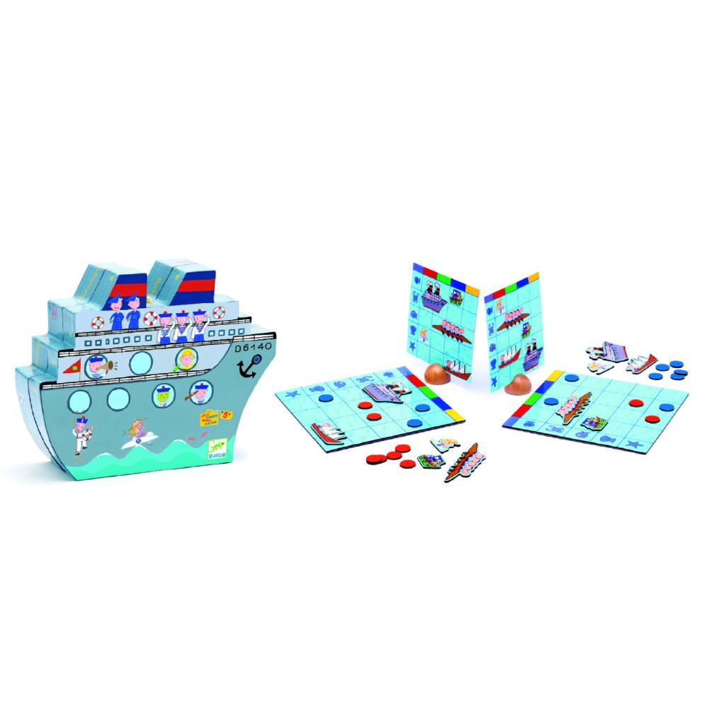 2 tavole magnetiche, 2 set di 5 navi, 22 pedine blu, 18 pedine rosse, 16 carte modelli e 2 basi di legno.