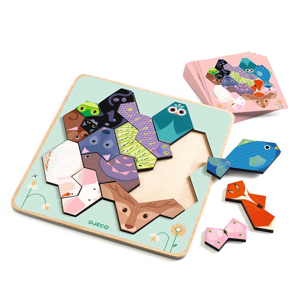 Il cuore del gioco è rappresentato da un robusto tabellone di legno e da 14 pezzi di legno con diverse forme geometriche e colori vivaci. Questi pezzi sono progettati per essere facilmente maneggiabili dalle piccole mani, rendendo l’attività accessibile e stimolante. I bambini dovranno osservare attentamente le 20 carte modello incluse, che mostrano le sagome di vari animali, e ricomporle utilizzando i pezzi geometrici.