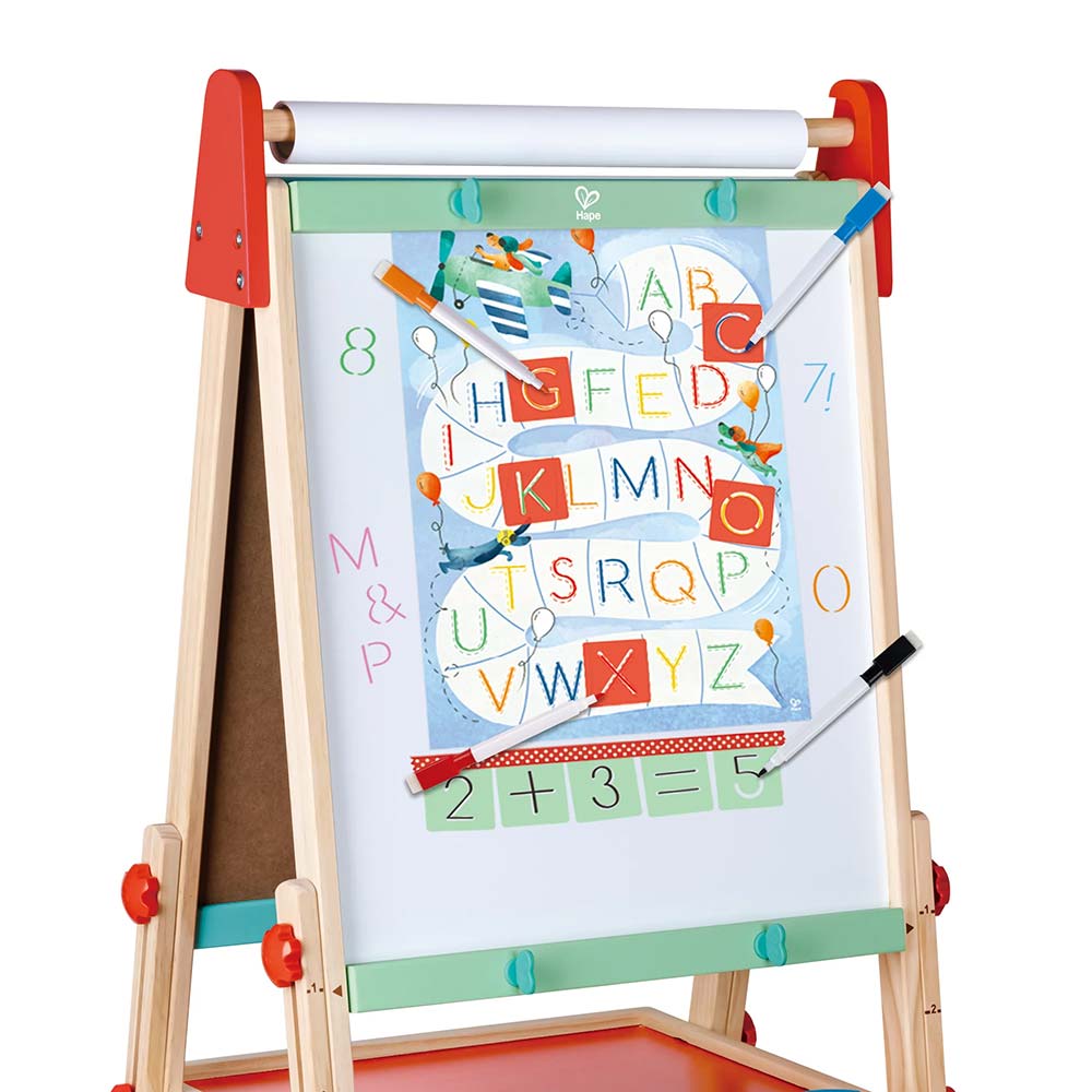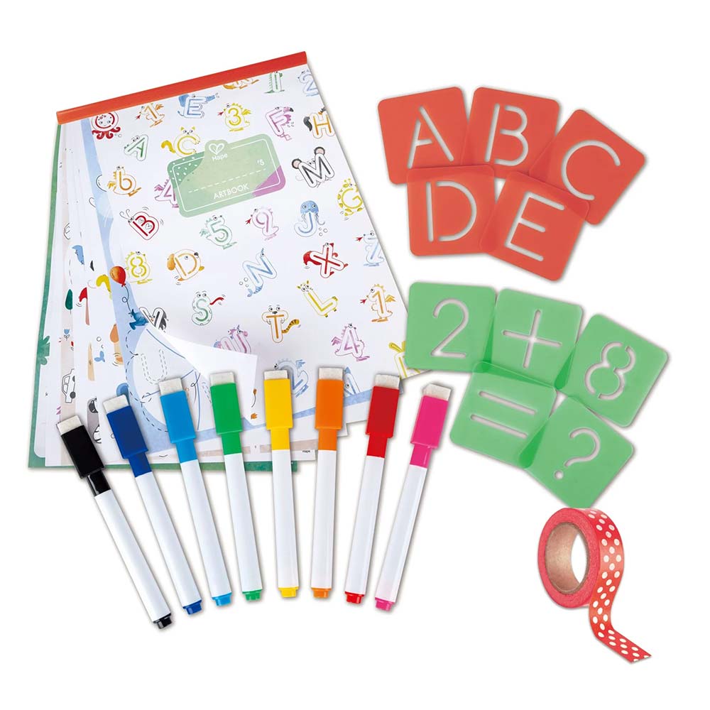 Il kit è perfetto da utilizzare con i cavalletti Hape e include dodici fogli di stencil, un nastro adesivo e otto pennarelli con gomma, compatibili con lavagne. Inoltre, il supporto per i fogli ti permetterà di scrivere con maggiore facilità e comodità.