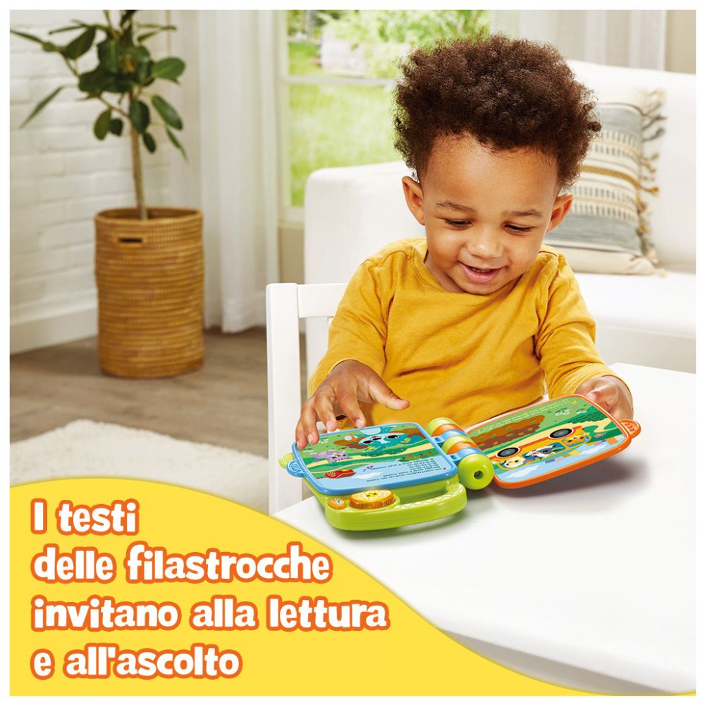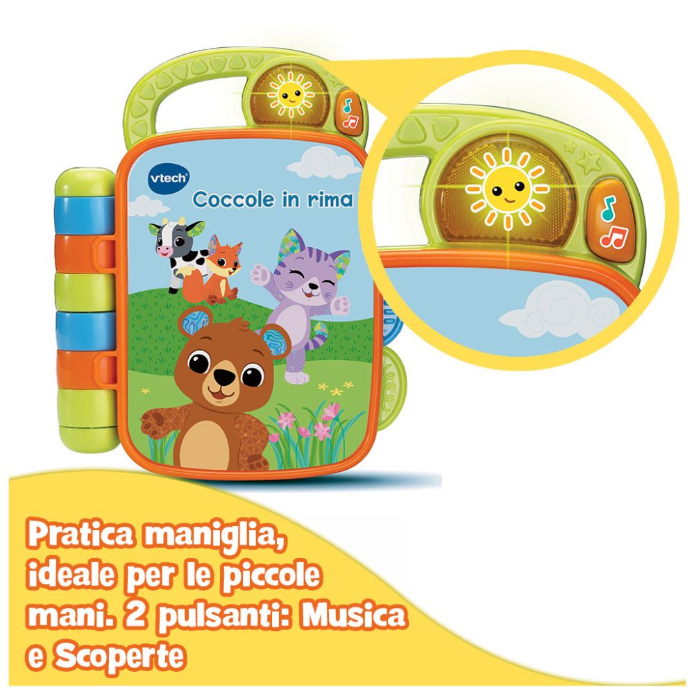 Il libro interattivo Vtech Coccole In Rima è un’esperienza multisensoriale progettata per accompagnare i più piccoli alla scoperta del mondo degli animali in modo divertente e coinvolgente. Attraverso quattro pagine illustrate e tasti interattivi, il bambino può esplorare due ambientazioni affascinanti: la fattoria e la foresta. La particolarità di questo libricino risiede nella sua magica copertina lenticolare 3D, che dà l’illusione che gli animali prendano vita a ogni movimento. Dotato di oltre 45 contenuti sonori, tra cui canzoni, suoni e frasi, il gioco offre due modalità principali: “Scoperta”, per imparare i nomi e i versi degli animali, e “Musica”, con 15 allegre melodie ideali per stimolare il ritmo e il movimento.
