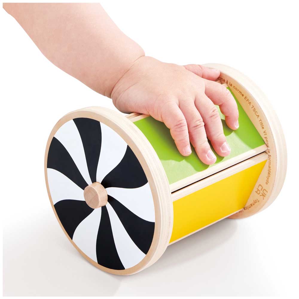 E’ uno strumento multisensoriale 2-in-1 progettato per accompagnare i neonati nelle loro prime e fondamentali fasi di scoperta. Questo giocattolo combina un tamburo rotante dinamico con una base a specchio, offrendo diverse modalità di interazione che stimolano la curiosità naturale. Il tamburo è decorato con pattern ad alto contrasto in bianco e nero e colori vivaci, ideali per favorire il tracciamento visivo. Quando viene fatto ruotare, il cilindro produce un suono nitido e delicato che cattura l’attenzione del bambino, promuovendo l’esplorazione uditiva. Realizzato con materiali sicuri e atossici, riflette l’eccellenza qualitativa di Hape nel supporto alla crescita della prima infanzia.