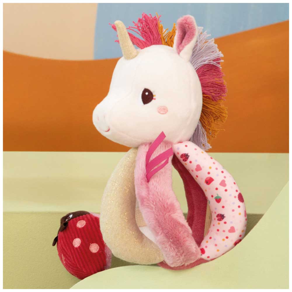 Realizzato con materiali di alta qualità come poliestere e cotone, il sonaglio Lena offre un’esperienza tattile varia grazie alle sue cinque maniglie con texture e fantasie differenti, che stimolano sia la vista che il tatto. La testa dell’unicorno nasconde un sonaglio che tintinna delicatamente, risvegliando la curiosità uditiva, mentre la carta frusciante integrata aggiunge un divertente elemento sonoro. Un secondo sonaglio, nascosto nella coccinella, incoraggia il bambino a esplorare e afferrare, affinando le capacità motorie.