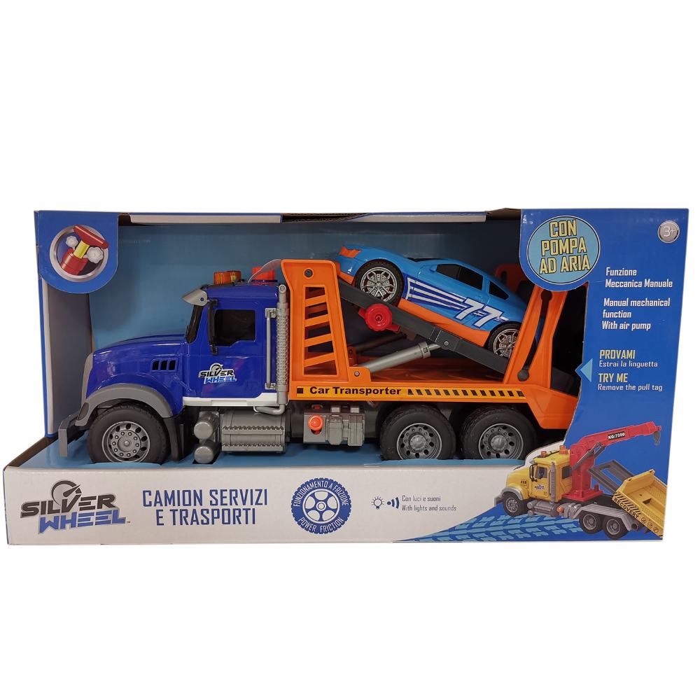 Camion servizi e trasporti con funzionamento a frizione, luci e suoni e pompa manuale che alza il rimorchio.