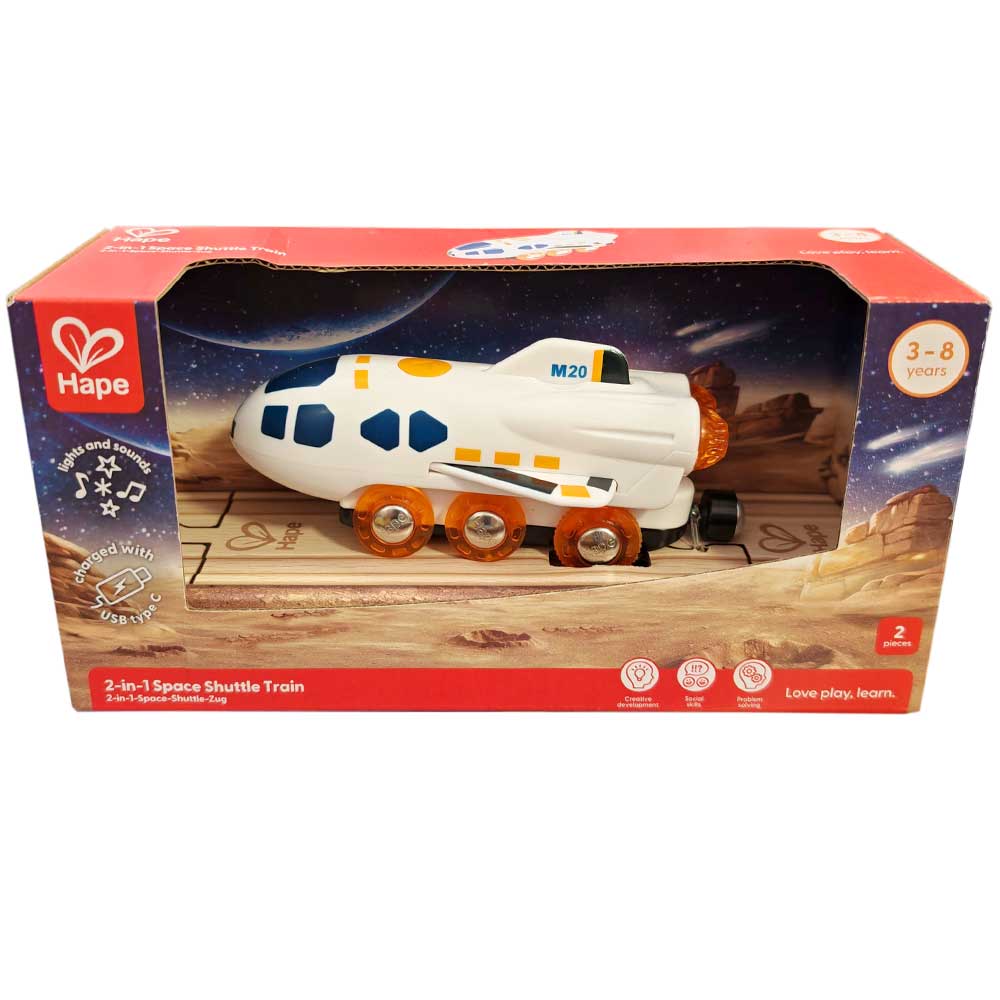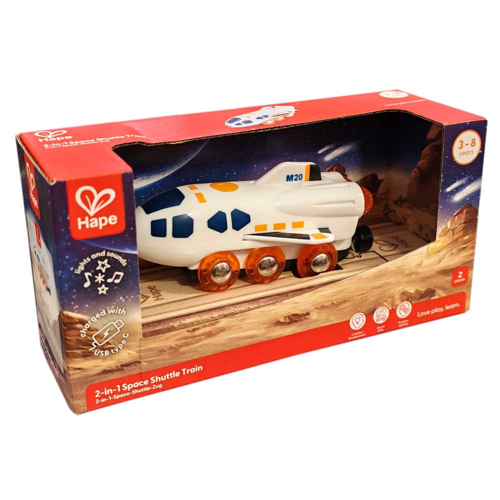 Prepara i tuoi piccoli a un’esperienza di gioco fuori dal comune con la Locomotiva Spaziale 2 in 1! Questa fantastica locomotiva a batteria ricaricabile non è solo un treno, ma si trasforma in un vero e proprio shuttle spaziale grazie alle sue ali retrattili con sistema a molla. Apri le ali per volare nello spazio e richiudile per tornare sui binari come una classica locomotiva. Con effetti sonori realistici e luci brillanti, ogni avventura sarà elettrizzante. Inoltre, grazie alla comoda ricarica USB Type-C, il divertimento non si ferma mai! Perfetta per arricchire qualsiasi set Hape Railway.