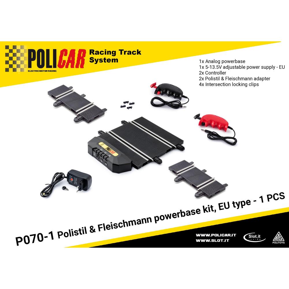 Set presa di corrente composta da powerbase, due pulsanti, alimentatore regolabile e due adattatori per connettere i vecchi binari della Polistil e Fleischmann. Questo kit vi permetterà di dar vita nuovamente alla vostra vecchia pista.