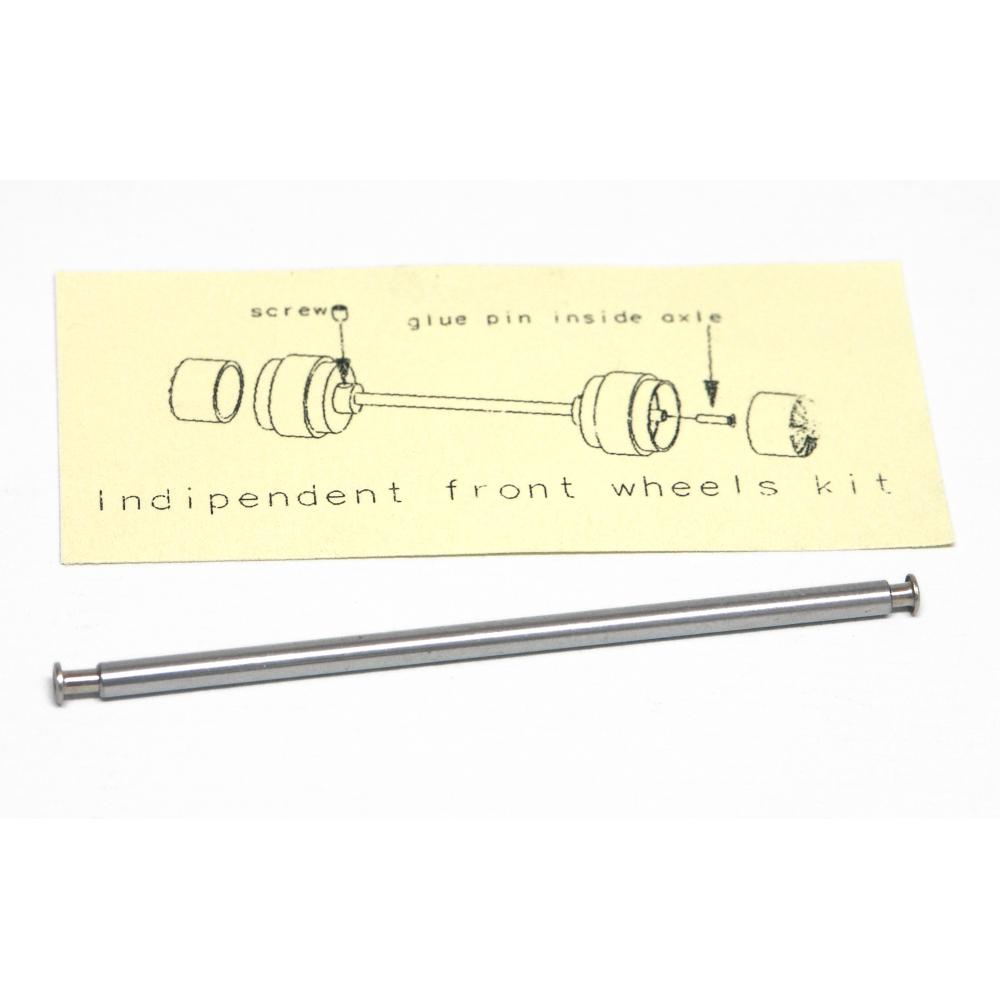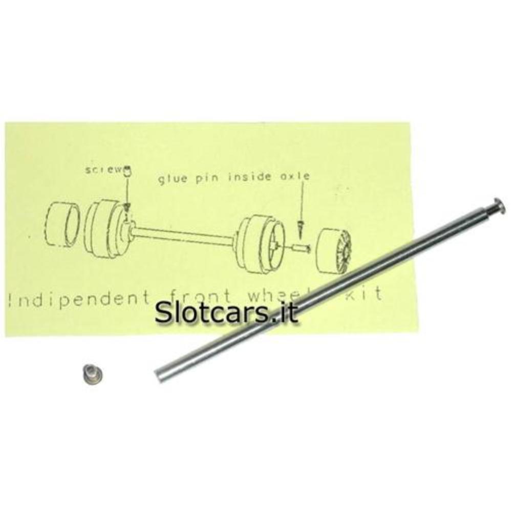 Nuovo accessorio della slot.it per montare le ruote anteriori indipendenti .Infatti in questo kit troviamo un assale forato ed un apposito occhiello di blocco. Per montarlo è sufficente fissare un cerchio all’assale con l’apposito grano , si installa l’assale sul telaio e quindi si posiziona il secondo cerchio che non deve essere bloccato con il grano. Posizionato il cerchio si inserirà l’occhiello nell’assale ed il gioco è fatto. Avremo un sistema semplice ma funzionale per le ruote anteriori indipendenti.