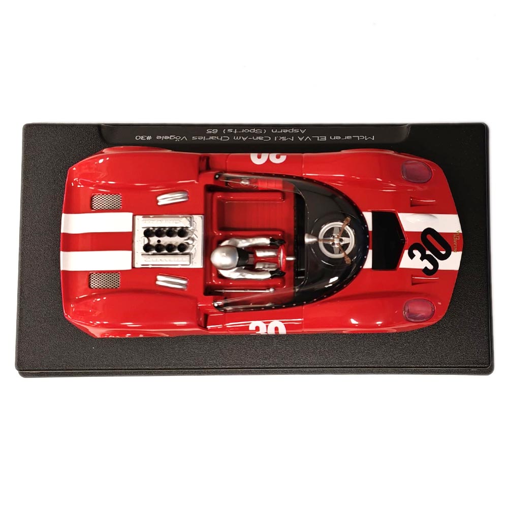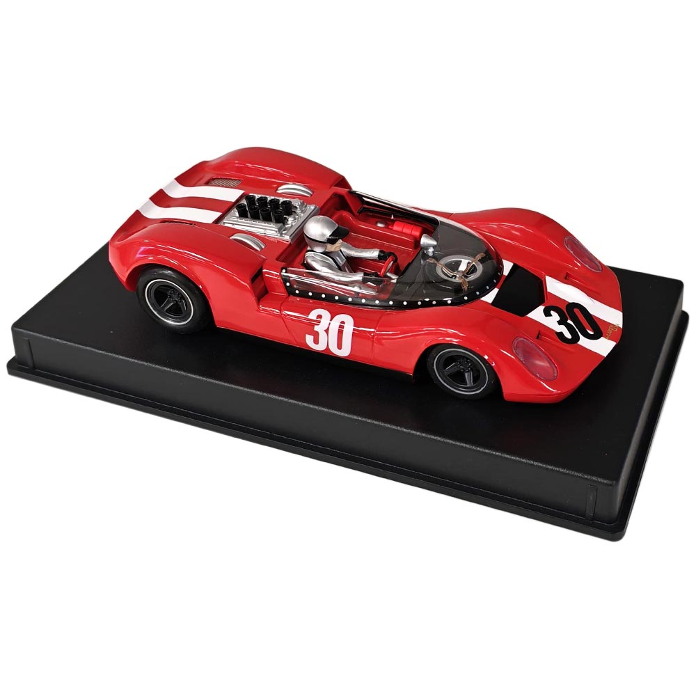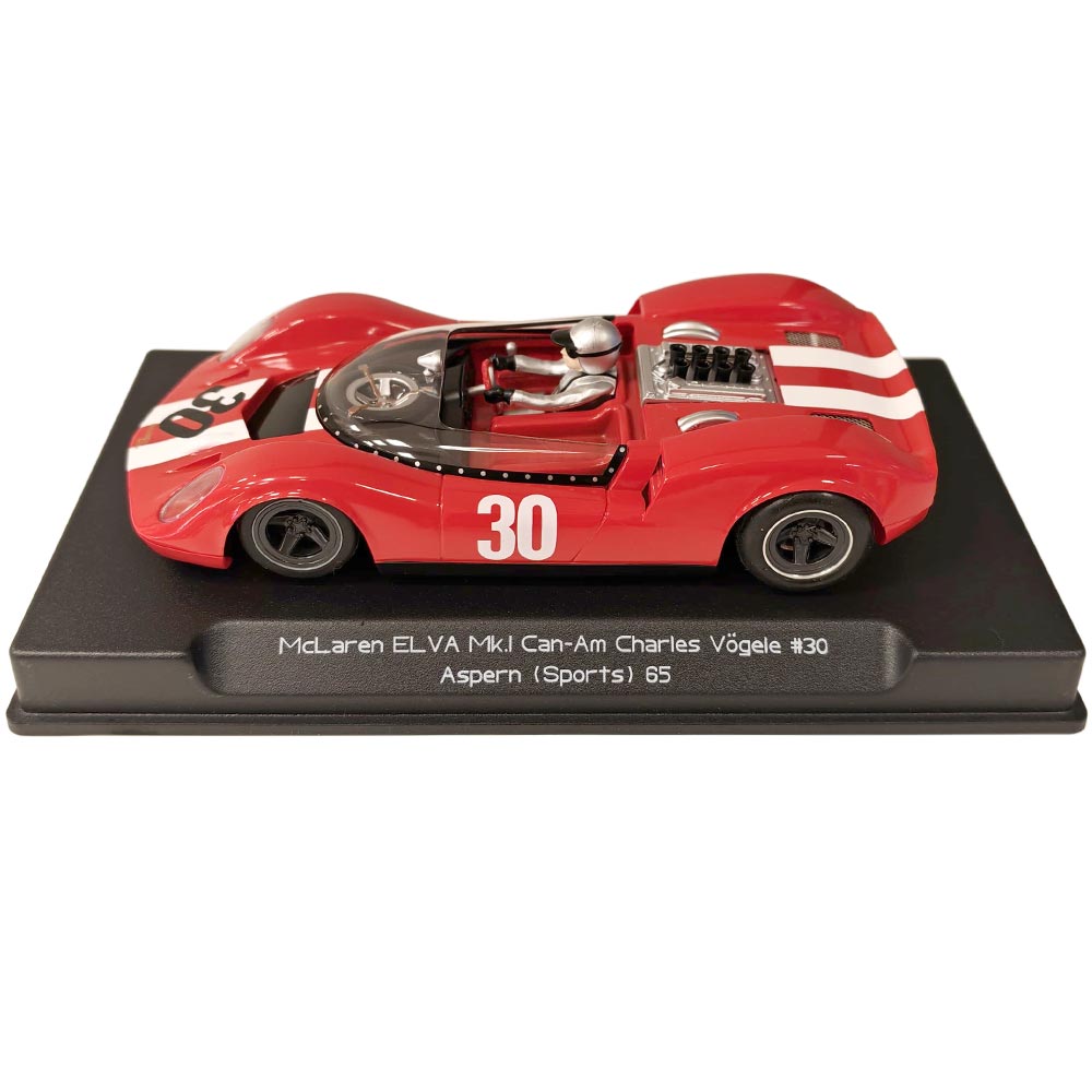 La McLaren Elva MkI Can-Am #30 è una riproduzione in scala 1:32 della vettura guidata da Charles Vögele, vincitrice della gara di Aspern nel 1965. Realizzata da Thunderslot, questa slot car analogica è progettata per offrire prestazioni elevate su piste in scala 1:32. Il modello presenta una configurazione sidewinder con motore inclinato a 2,5°, migliorando la distribuzione del peso e la trazione. Il telaio a due pezzi con supporto motore triangolare assicura rigidità e stabilità, mentre i cerchi posteriori in alluminio alleggeriti e le gomme posteriori morbide garantiscono una trazione ottimale. Il design accurato e le caratteristiche tecniche avanzate rendono questa slot car ideale per appassionati e collezionisti.